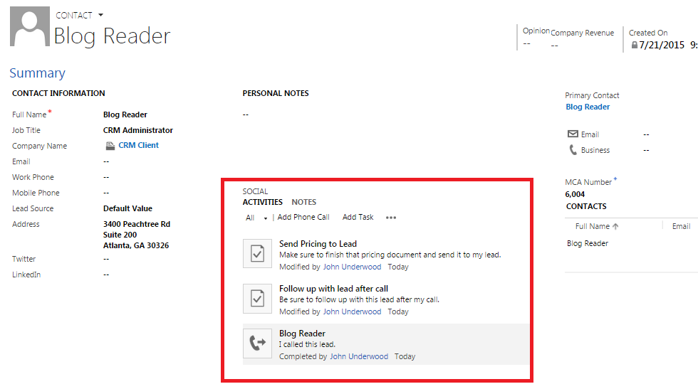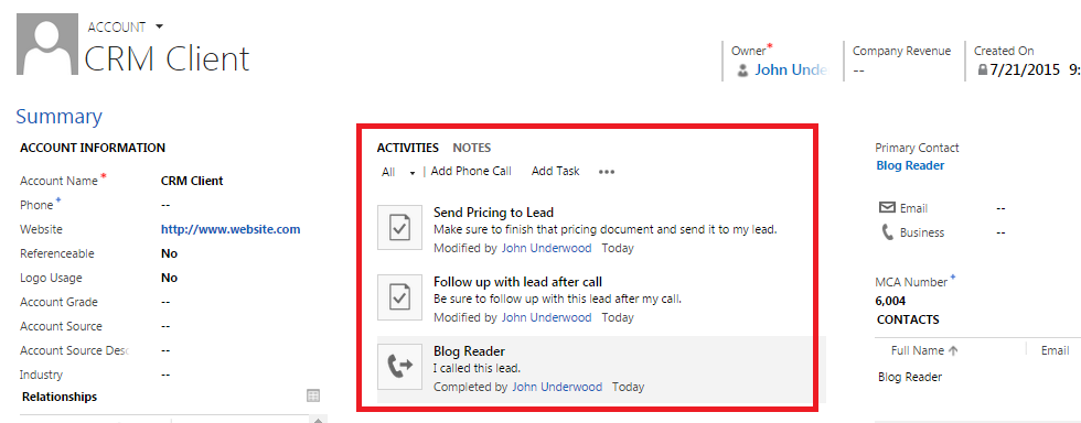 Now that the system has created the Account, and associated the other records to it, any new activity added to the opportunity or the contact will automatically be rolled up to the Account for a continuous communication thread.