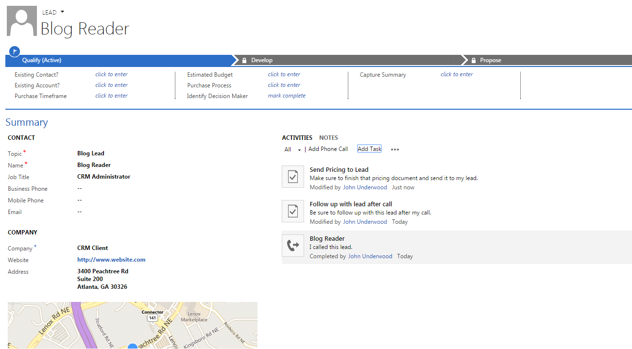 Next, I’ll qualify the lead to convert it to an opportunity, a contact, and an account. Now I can view my lead activities on all three of the newly created entities:
